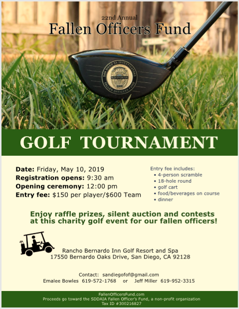 Please join us on Friday, May 10th at Rancho Bernardo Inn Golf Resort and Spa for the 22nd Annual Fallen Officers Fund Golf Tournament.
